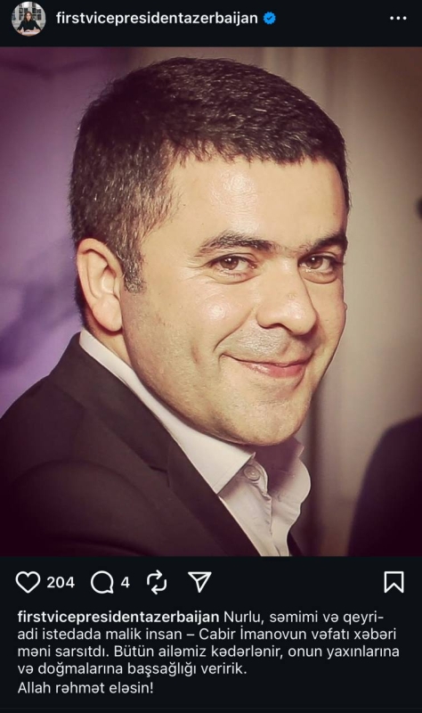 Mehriban Əliyeva Cabir İmanovun ölümü ilə bağlı paylaşım edib.